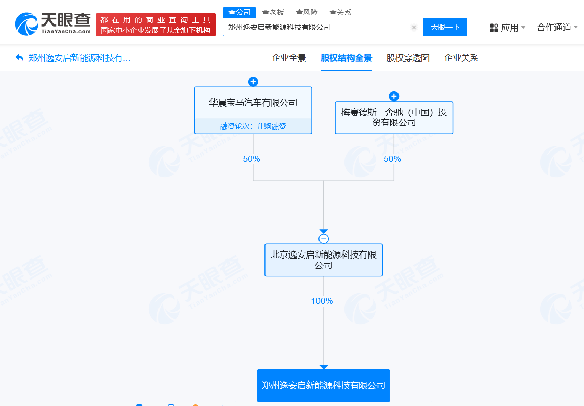 天眼查App显示,近日,郑州逸安启新能源科技有限公司成立,法定代表人为SHIFANG师方,注册资本500万人民币,经营范围含发电业务、输电业务、供(配)电业务,新兴能源技术研发,新能源汽车电附件销售,智能输配电及控制设备销售,新能源汽车换电设施销售,太阳能发电技术服务,储能技术服务等。股权全景穿透图显示,该公司由北京逸安启新能源科技有限公司全资持股,后者由梅赛德斯一奔驰(中国)投资有限公司、华晨宝马汽车有限公司共同持股。