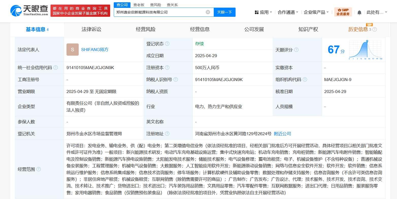 天眼查App显示,近日,郑州逸安启新能源科技有限公司成立,法定代表人为SHIFANG师方,注册资本500万人民币,经营范围含发电业务、输电业务、供(配)电业务,新兴能源技术研发,新能源汽车电附件销售,智能输配电及控制设备销售,新能源汽车换电设施销售,太阳能发电技术服务,储能技术服务等。