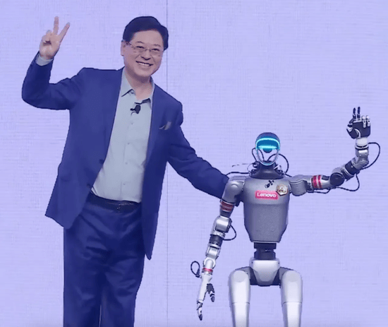 大会现场,乐享企业终端代表——乐享壹号人形机器人登场,并戴上联想工牌,成为联想的首位“硅基员工”。