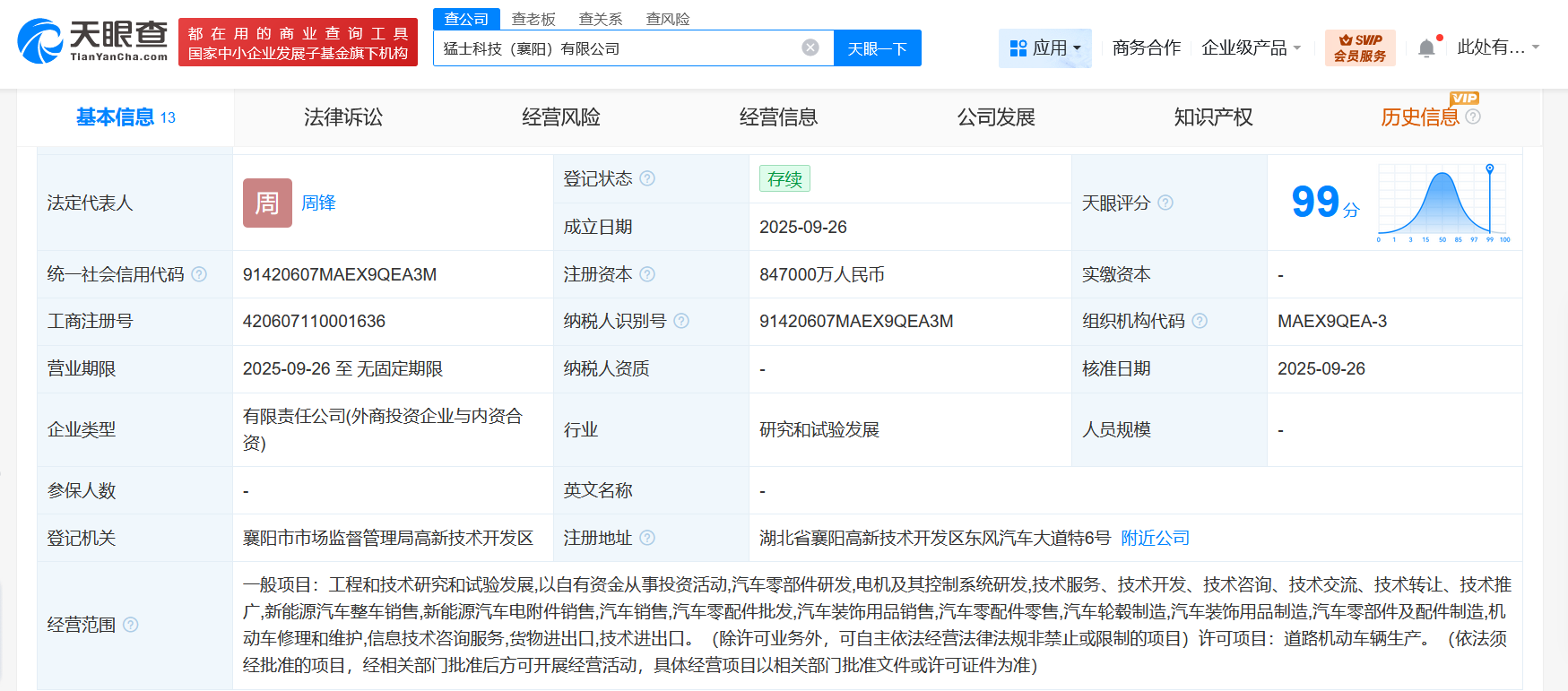 天眼查App显示,近日,猛士科技(襄阳)有限公司成立,法定代表人为周锋,注册资本84.7亿人民币,经营范围含工程和技术研究和试验发展、以自有资金从事投资活动、汽车零部件研发、电机及其控制系统研发、新能源汽车整车销售、新能源汽车电附件销售、汽车销售、汽车零配件批发、汽车装饰用品销售等。股东信息显示,该公司由东风汽车集团股份有限公司、襄阳产城融合发展控股有限公司、湖北襄高衡石科技投资有限公司、东风汽车有限公司共同持股。