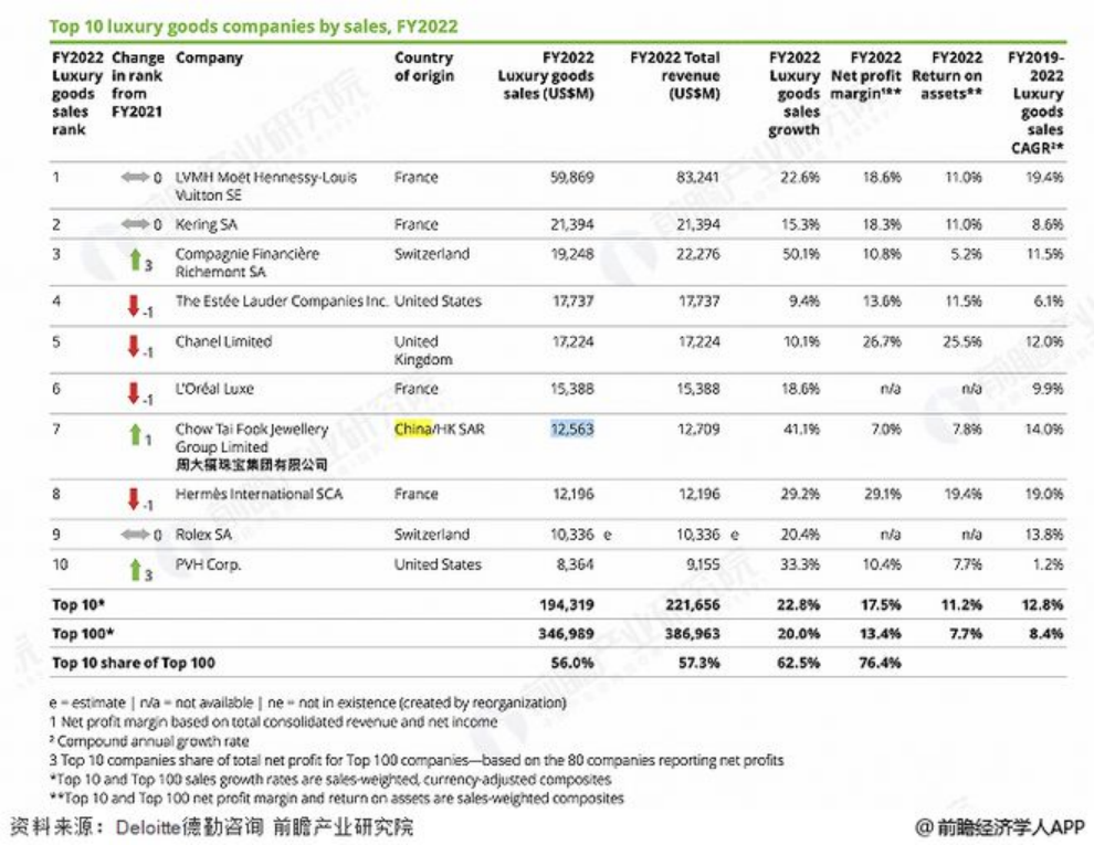 在德勤的榜单中,前十净利率均值为17.5%,爱马仕的净利率高达29.1%,而周大福2023年的净利润率为7%,其奢侈属性远远不足其他。