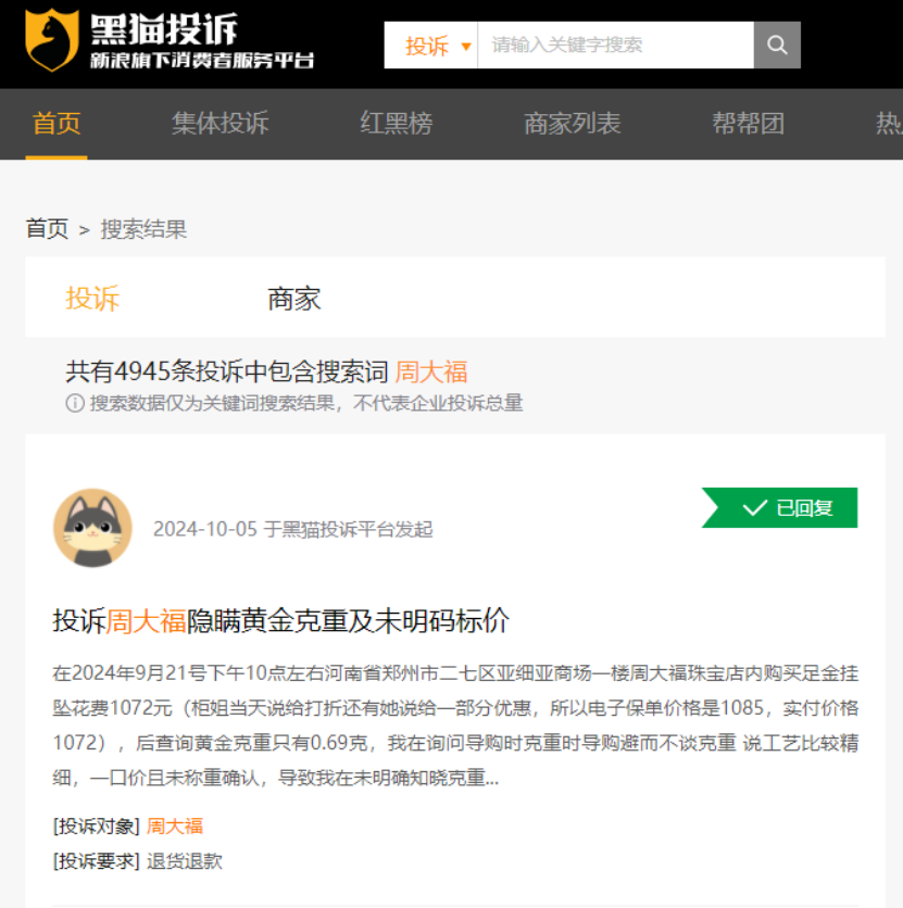 另外,周大福除了“贵”,在社交平台被大众广为吐槽的点居然是“服务态度差”。在小红书搜索#周大福服务#有3w+帖子,其中大部分都是吐槽贴。在黑猫投诉上,周大福的投诉已经将近5000条,在去年9月是超3300条,一年时间增加了近1700条。