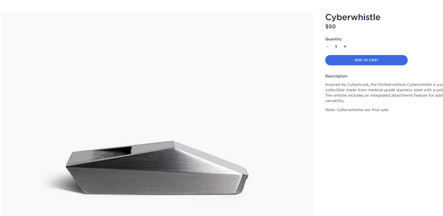 12月1日早间消息,特斯拉推出限量版赛博卡车造型哨子,售价每只50美元(约合人民币318元),其CEO埃隆·马斯克为该产品在Twitter卖力宣传,表示“别给苹果抛光布交智商税,快来买特斯拉哨子吧!”