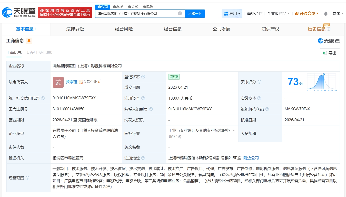 天眼查App显示,4月21日,博越星际蓝图(上海)影视科技有限公司成立,法定代表人为姜寨瑾,注册资本1000万人民币,经营范围包括广告制作、电影摄制服务、版权代理等,由博纳影业(001330)全资持股。