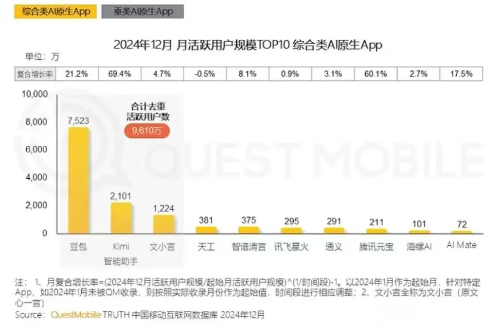 根据QuestMobile数据,2024年12月文心一言的月活跃用户数(MAU)虽然仍在综合类AI原生APP中稳居前三,但1224万的规模远不及排名第二的Kimi智能助手,同期豆包的月活量更是高达7523万,是文心一言的6倍有余。