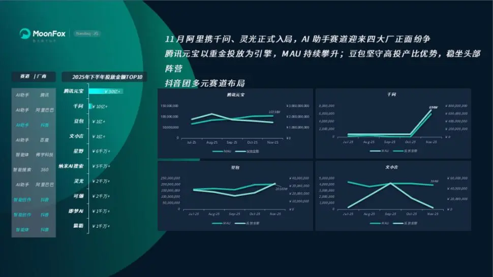 由于错失增长关键期,文心一言的投产比也迟迟处于低位,月狐数据显示2025年下半年文心一言累计投流超1亿元,高额的营销投入在AI应用投放金额排行榜中位列第四,但其月活跃用户数(MAU)却不进反退。