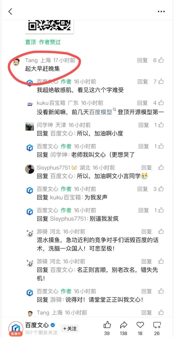 百度在2023年3月率先发布文心一言时选择了“闭源+收费”商业模式,李彦宏还曾公开表示开源模型是一种“智商税”,强调闭源模型在性能、推理成本和效率上的优势,但仍有网友犀利指出“失去开发者生态才是最高昂的税”。