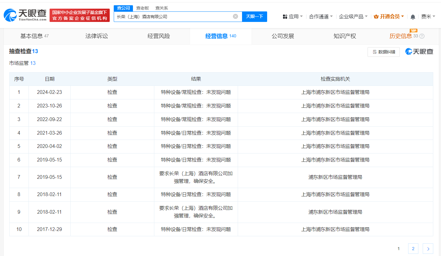 天眼查App显示,长荣桂冠酒店旗下内地关联公司为长荣(上海)酒店有限公司,其成立于2011年3月,法定代表人为叶佳全,注册资本8000万美元,由长荣国际股份有限公司全资持股。经营信息显示,该公司在2017年“对重点单位履行消防安全职责的抽查”项目中,被发现存在违法违规行为并责令改正。此外,该公司在2018年和2019年的抽检中,曾被要求加强管理,确保安全。