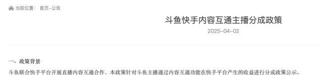 一方面,为应对主播流失问题,斗鱼持续推出多项主播扶持计划。去年11月,平台启动了游戏主播收入成长激励项目,并面向全网开展游戏分区校园主播招募活动。今年4月,斗鱼进一步与快手平台达成直播内容互通合作,以拓展主播观众群体和影响力。