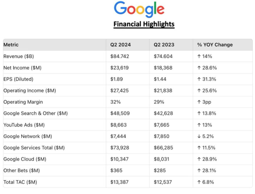 谷歌Alphabet 2024年第二季度营收847.42亿美元增长14%,净利润236.19亿美元同比增长29%快讯