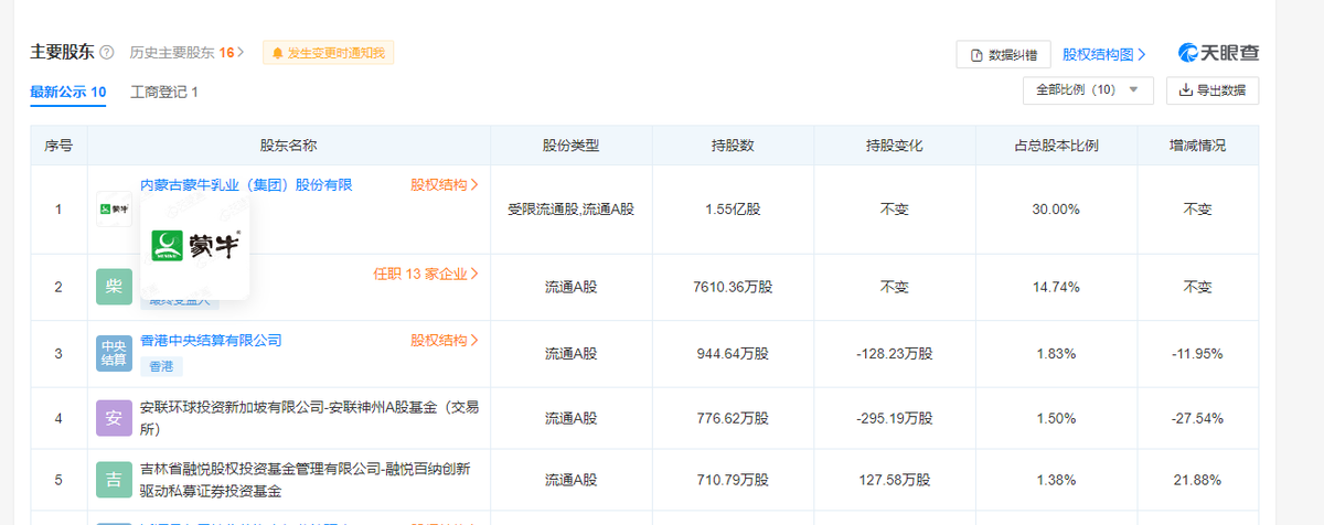 根据报告内容,蒙牛采用部分要约收购的方式增持上市公司股份。据公告内容,蒙牛将以现金支付的方式再次收购妙可蓝多5%的股权,此次收购完成后,蒙牛持股妙可蓝多比例将上升至35%。天眼查APP信息显示,目前蒙牛为妙可蓝多第一大股东,持股比例为30%。