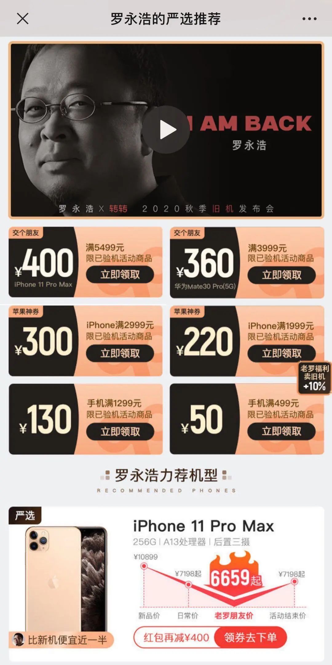 与此同时,来自转转严选卖场的iPhone11 Pro Max、小米10Pro、华为Mate30Pro等也成为老罗力荐的机型。