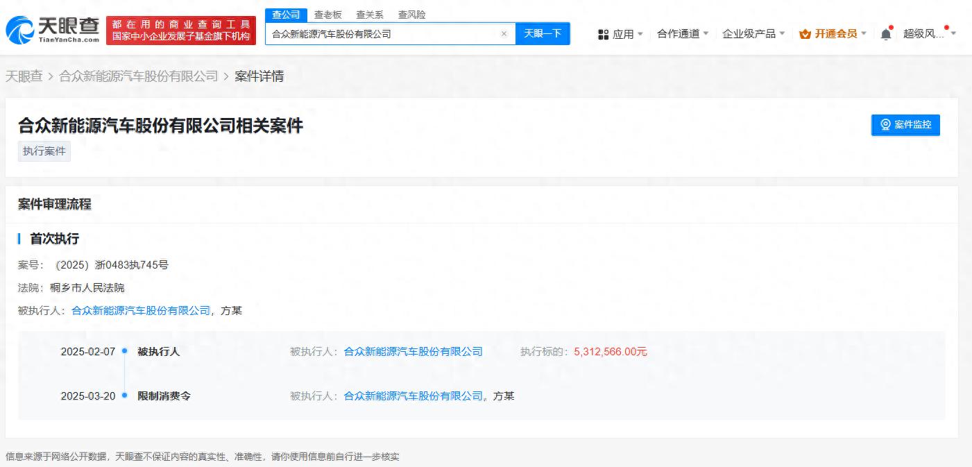 天眼查App显示,上海禹形广告有限公司成立于2016年10月,法定代表人为安堃,注册资本100万,经营范围包括广告发布、广告制作、市场营销策划等,由安堃、上海行尚文化传播有限公司共同持股。风险信息显示,今年2月,合众新能源汽车股份有限公司因与该公司合同纠纷案件,被桐乡市人民法院执行531万元。今年3月,合众新能源汽车股份有限公司及方运舟已因此案被限制高消费。