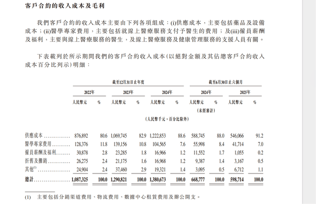 从招股书数据来看,2025年上半年,在客户合约成本中,占比达到91%的是供应成本,这个供应成本包括药品以及设备成本,这些都是不可变成本。