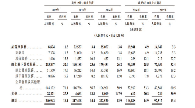 从2022年到2025年上半年,云药房业务的毛利率从1.5%提升到3.3%;增值服务毛利率从15.3%提升到22.7%;线上线下医疗服务毛利率从32%提升到32.4%;其他业务毛利率从27.3%提升到30.9%。