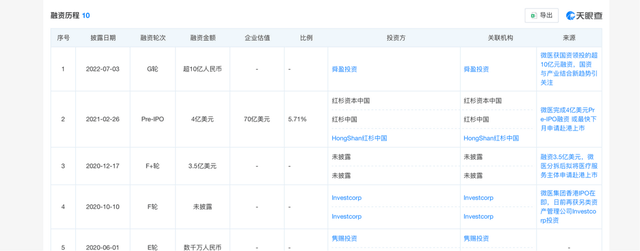 医疗、科技行业里,能够在一级市场上融资到G轮的企业并不多,天眼查APP信息显示,微医G轮融资依然融到了超10亿元人民币。
