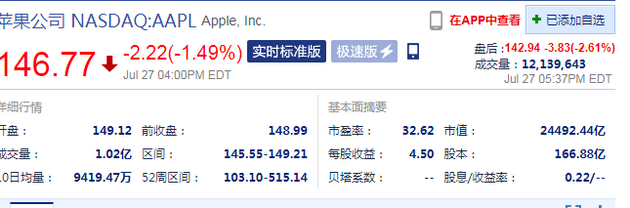 北京时间7月28日凌晨消息,据报道,苹果公司今天发布了2021财年第三财季业绩。当日,苹果公司股价在纳斯达克常规交易中下跌2.22美元,报收于146.77美元,跌幅为1.49%。苹果公司第三财季营收和每股收益均超出华尔街分析师此前预期,但其盘后股价仍旧跌超2%。