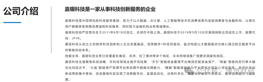 据官网介绍,嘉银科技自称是中国领先的科技服务集团,致力于以大数据、云计算、人工智能等技术在消费场景内连接消费者与金融机构,让每位用户都能享受到高效便捷的科技服务,同时助力金融机构业务高速增长。