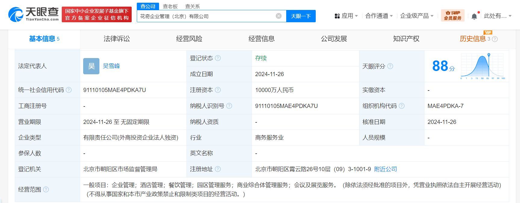 天眼查App显示,近日,花奇企业管理(北京)有限公司成立,法定代表人为吴雪峰,注册资本1亿人民币,经营范围为企业管理、酒店管理、餐饮管理、园区管理服务、商业综合体管理服务、会议及展览服务。股东信息显示,该公司由花旗旗下花奇控股(北京)有限公司全资持股。