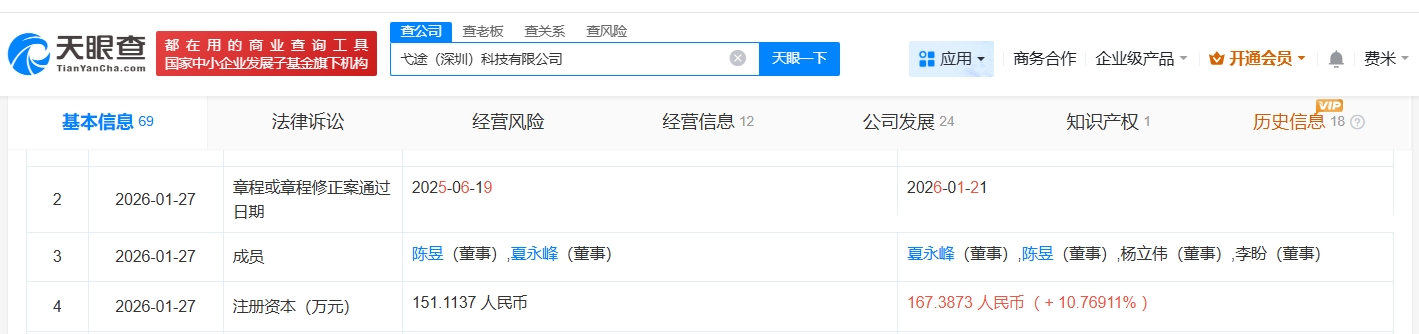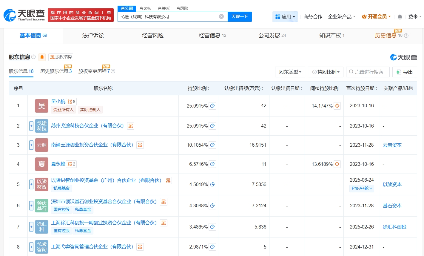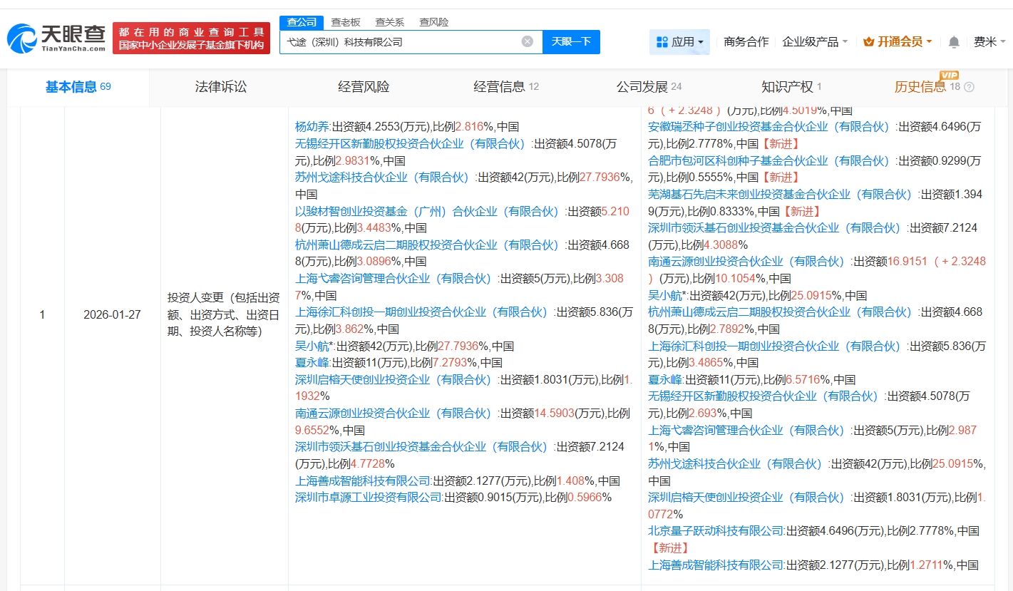 弋途(深圳)科技有限公司成立于2023年10月,法定代表人为吴小航,经营范围包括汽车零部件及配件制造、智能车载设备制造、智能车载设备销售等。股东信息显示,该公司现由吴小航、苏州戈途科技合伙企业(有限合伙)及上述新增股东等共同持股。公开资料显示,该公司致力于汽车行业基础中间件、服务中间件、AI中间件的研发和商业化落地。