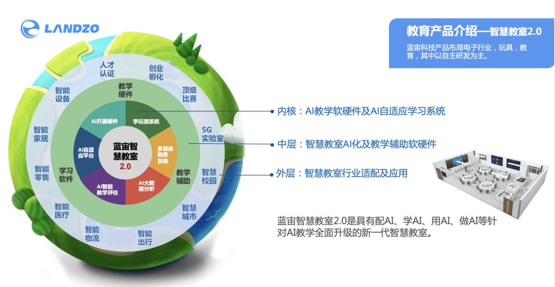 此外,蓝宙还推出了两种类型的教育产品:一是针对C端用户的蓝宙星球STEAM课程体系,二是服务于各中小学及高中学生的AI人工智能学习解决方案——蓝宙AI智慧教室。