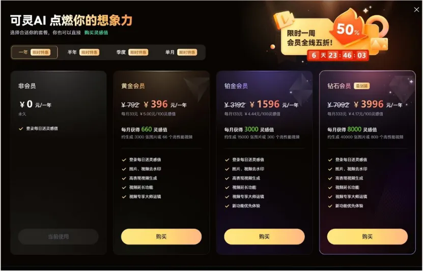 用户规模是产品商业化的土壤,基于此,外界对于可灵商业化的想象空间也被进一步打开。目前,可灵AI已经上线了付费会员体系,分为黄金、铂金、钻石三个级别,月卡价格分别为66元、266元和666元,对应生成约66个、300个或800个标准视频。