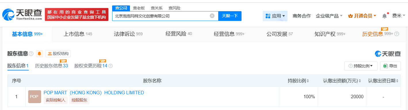 该公司成立于2010年10月,法定代表人为王宁,注册资本2亿人民币,经营范围包括组织文化艺术交流活动、礼品花卉销售、文具用品零售等,由POP MART(HONG KONG)HOLDING LIMITED全资持股。