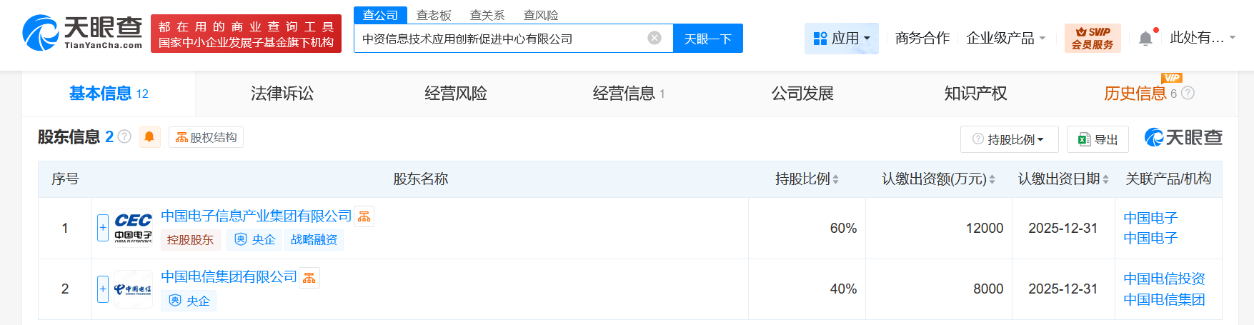 天眼查App显示,近日,中资信息技术应用创新促进中心有限公司成立,法定代表人为徐建堂,注册资本2亿人民币,经营范围含大数据服务、数据处理服务、互联网数据服务、安全技术防范系统设计施工服务、信息安全设备销售、网络与信息安全软件开发、信息技术咨询服务、信息咨询服务等。股东信息显示,该公司由中国电子信息产业集团有限公司、中国电信集团有限公司分别持股60%、40%。
