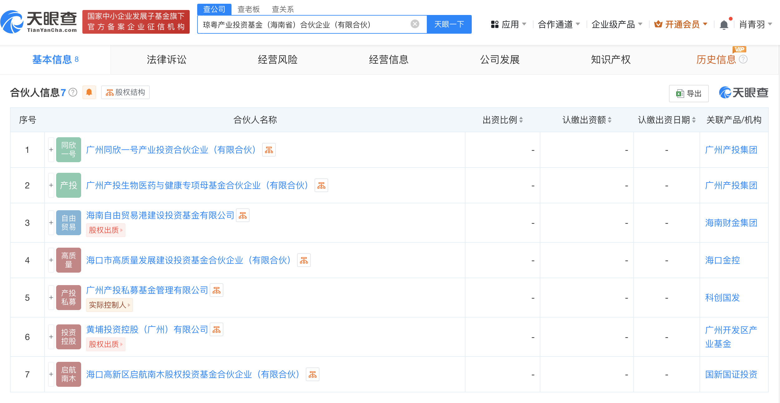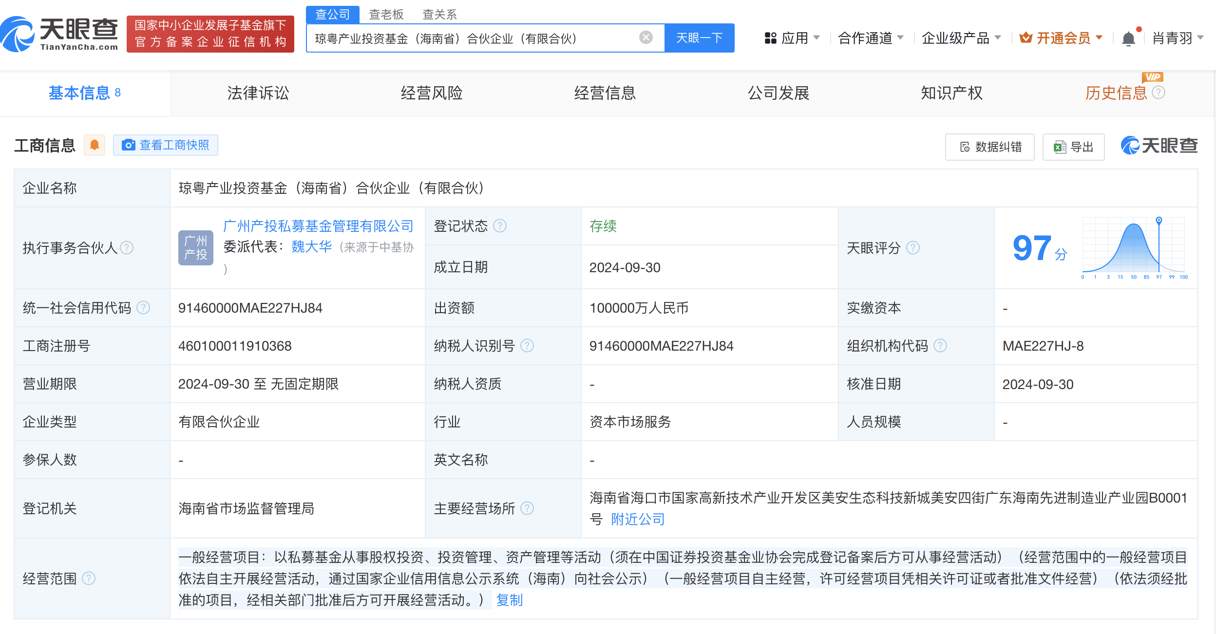 天眼查App显示,近日,琼粤产业投资基金(海南省)合伙企业(有限合伙)成立,执行事务合伙人为广州产投私募基金管理有限公司,出资额10亿人民币,经营范围为以私募基金从事股权投资、投资管理、资产管理等活动。合伙人信息显示,该基金由广州同欣一号产业投资合伙企业(有限合伙)、广州产投生物医药与健康专项母基金合伙企业(有限合伙)、海南自由贸易港建设投资基金有限公司等共同出资。