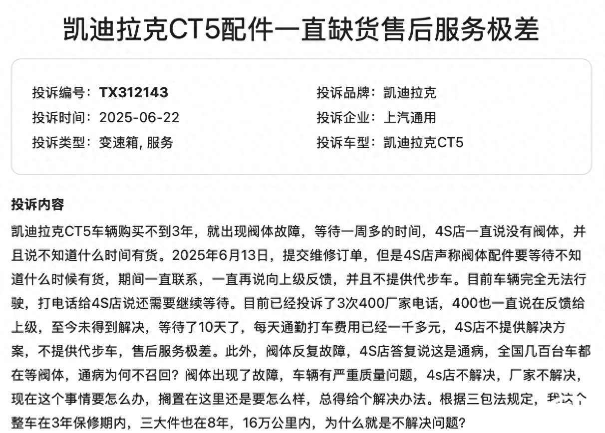 一位凯迪拉克CT5的车主向汽车门网投诉称,车辆购买不到三年就出现了阀体故障问题,到4S店维修时,4S店声称需要更换的阀体配件没货,也没有具体的配货时间,需要车主继续等待。现如今,故障车辆无法行驶,在这期间4S店也没有向车主提供代步车。在等待配件期间,严重影响了车主的日常生活,而且日常通勤的打车费用需要车主自费。而且,关于变速箱阀体反复故障的原因,厂家解释这属于车型通病,全国有数百台故障车辆都在等待阀体。车主认为既然全国大范围内出现问题,厂商应当召回或者给车主合理的补偿方案。现如今,车辆还在质保期内,只能苦苦等到配件到货,他认为厂商这样的处理方式十分不合理。