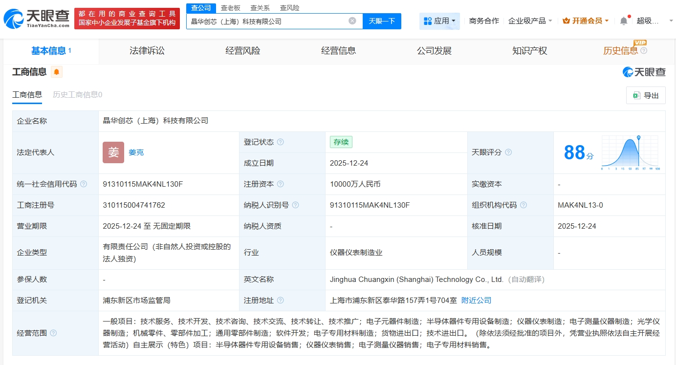 天眼查App显示,近日,晶华创芯(上海)科技有限公司成立,法定代表人为姜克,注册资本1亿人民币,经营范围包括电子元器件制造、半导体器件专用设备制造、仪器仪表制造、电子测量仪器制造等。
