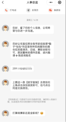 据杨小姐回忆,她是通过58同城看到相关招聘信息,然后招聘者通过微信联系到她,然后去公司面试。