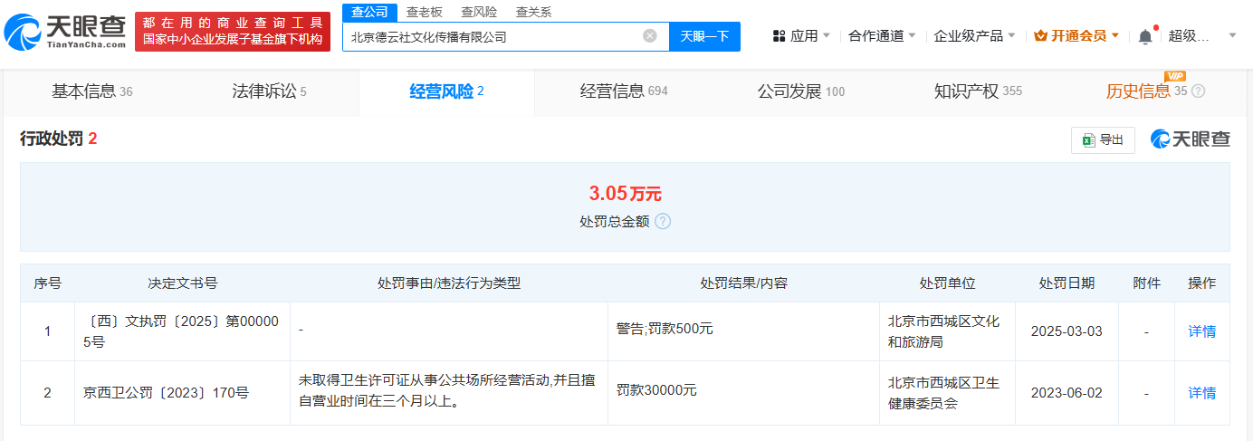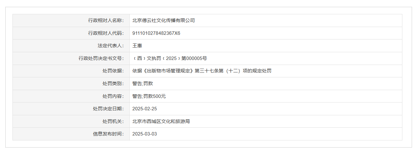 天眼查App显示,近日,北京德云社文化传播有限公司因违反《出版物市场管理规定》第三十七条第(十二)项的规定,不按规定接受年度核验,被北京市西城区文化和旅游局罚款500元。