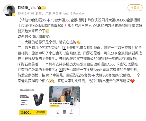 就在大疆因部分产品陷入“起雾门”风波之时,作为头号竞争对手的影石创新CEO刘靖康却意外发声。8月1日凌晨,他在微博上公开向大疆表示“祝贺”,同时宣布将自家新品Insta360 X5降价500元,商战意味浓厚。