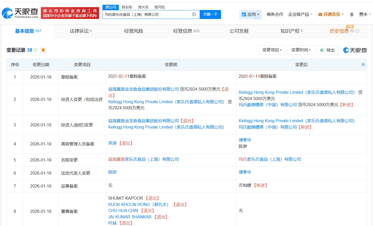 天眼查工商信息显示,近日,益海嘉里家乐氏食品(上海)有限公司发生工商变更,企业名称变更为玛氏家乐氏食品(上海)有限公司,原股东金龙鱼(300999)退出,新增玛氏箭牌糖果(中国)有限公司为股东,陈波卸任法定代表人,由濮春华接任,同时,多位主要人员发生变更。