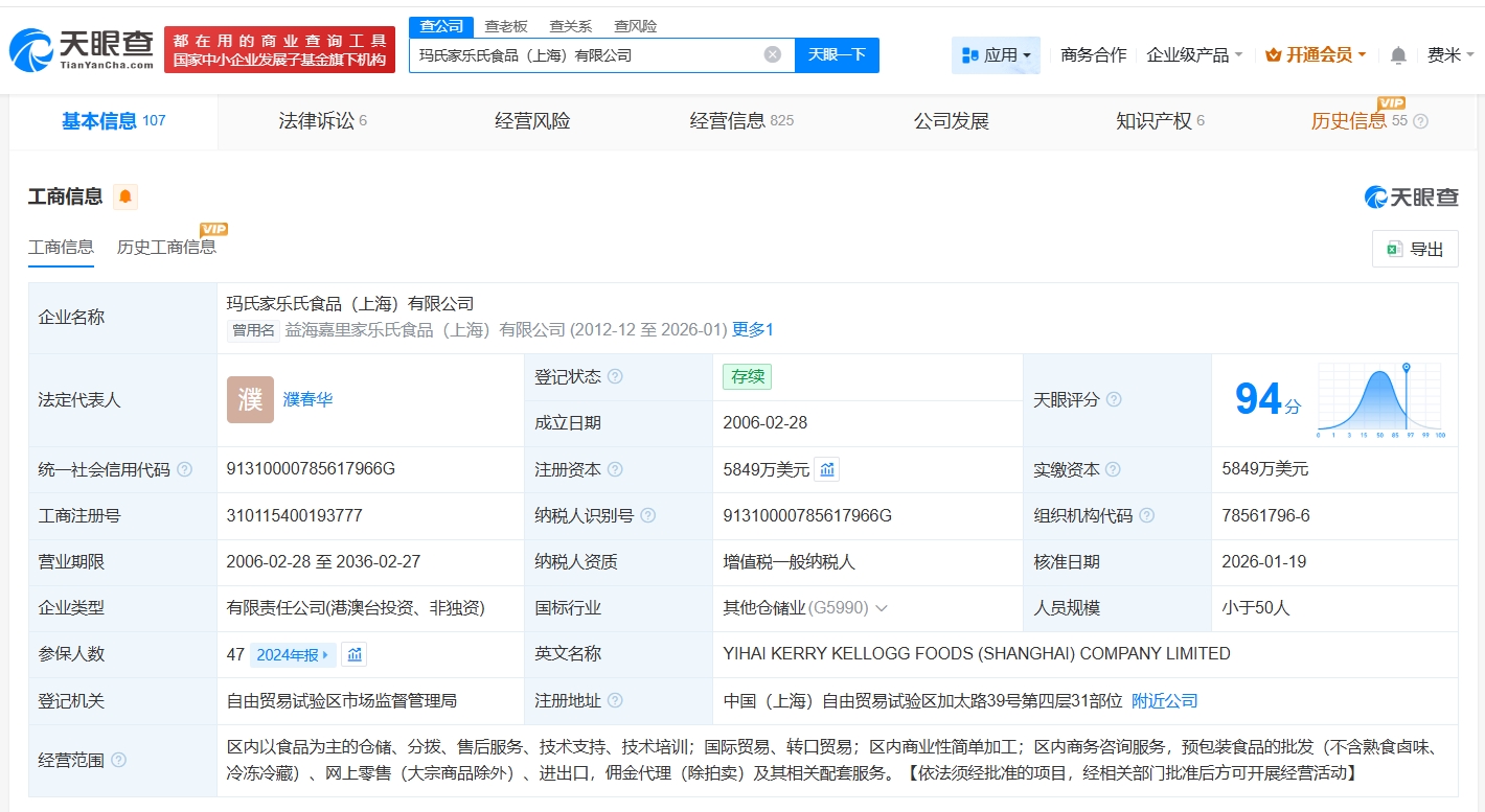 玛氏家乐氏食品(上海)有限公司成立于2006年2月,注册资本5849万美元,经营范围包括区内以食品为主的仓储、分拨、售后服务、技术支持、技术培训等。股东信息显示,该公司现由家乐氏香港私人有限公司及上述新增股东共同持股。