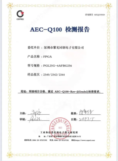 为了满足汽车领域急速增长的应用需求,紫光同创推出Logos系列高性价比车规级FPGA器件PGL25G-6AFBG256及全套自主开发软件和IP方案。该产品在中国赛宝实验室通过车规相关测试并获得AEC-Q100 Grade 2车规认证,可满足座舱显示、LED车灯等市场应用需求。目前该产品已向汽车领域重点客户送样,即将量产发货。