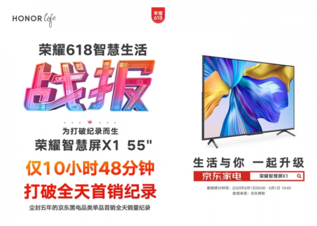 根据官方最新战报显示,凭借标杆品质和极致性价比,当京东618首轮活动开启后,荣耀智慧屏X1 55英寸10分钟销量立即突破2万台。
