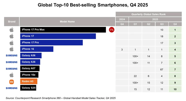 该报告指出,在2025年第四季度的全球十大畅销手机榜单中,苹果强势拿下了五个席位。其中,顶配机型iPhone 17 Pro Max凭借极高的人气位居榜首,紧随其后的是iPhone 17标准版与iPhone 17 Pro。