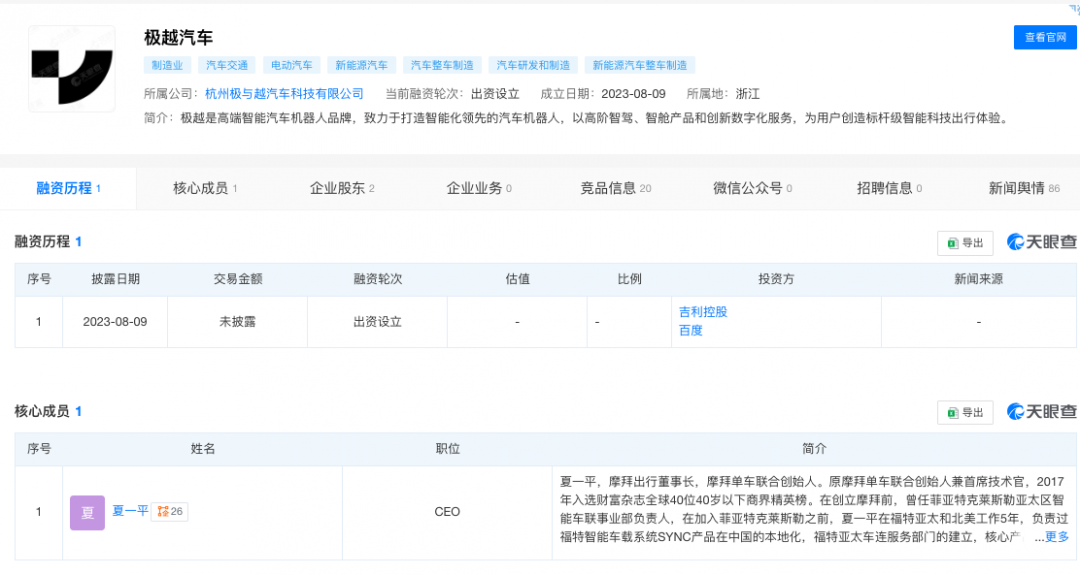 天眼查信息显示,极越汽车品牌的机构主体是杭州极与越汽车科技有限公司,浙江吉利产投控股有限公司持股65%为其控股股东,百度旗下上海幂航汽车有限公司 (曾用名:集度汽车有限公司) 持股35% 。