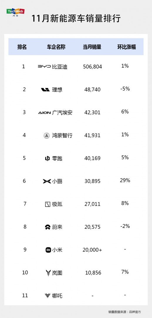 从TechWeb汇总的11月国内主要新能源车品牌销量数据来看,多家车企销量均创历史新高。其中,比亚迪月销再次突破50万辆,一骑绝尘;理想汽车月销超4.8万辆;零跑汽车首次突破4万辆大关;小鹏汽车突破3万辆,再创新高;小米汽车连续2月交付超过2万台……极越汽车的月销量已经被远远甩在后面。