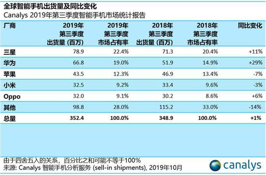 华为凶猛。尽管遭遇谷歌服务禁用等诸多不利因素影响,第三季度华为智能手机全球出货量依然同比猛增29%,拿下了19%的市场份额,不仅拉开了和第三名苹果的差距,更进一步缩小了和榜首三星的距离(虽然当季三星出货量也在显著增长,数据来自Canalys)。余承东在去年年底预计,华为有望两年内超越三星,登上全球智能手机出货量榜首。可以设想,如果不是今年遭遇系列非贸易壁垒打击,余承东这个规划是完全可行的。