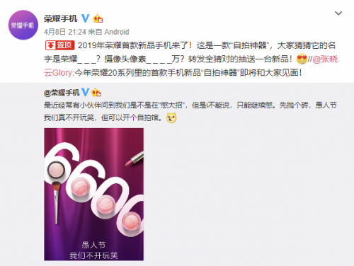 4 月 8 日,荣耀战略和品牌发展官张晓云透露,荣耀 20 系列的首款新品“自拍神器”即将发布。荣耀手机官微还悬疑了它的名字和前置摄像头像素,不过现在都有了答案。