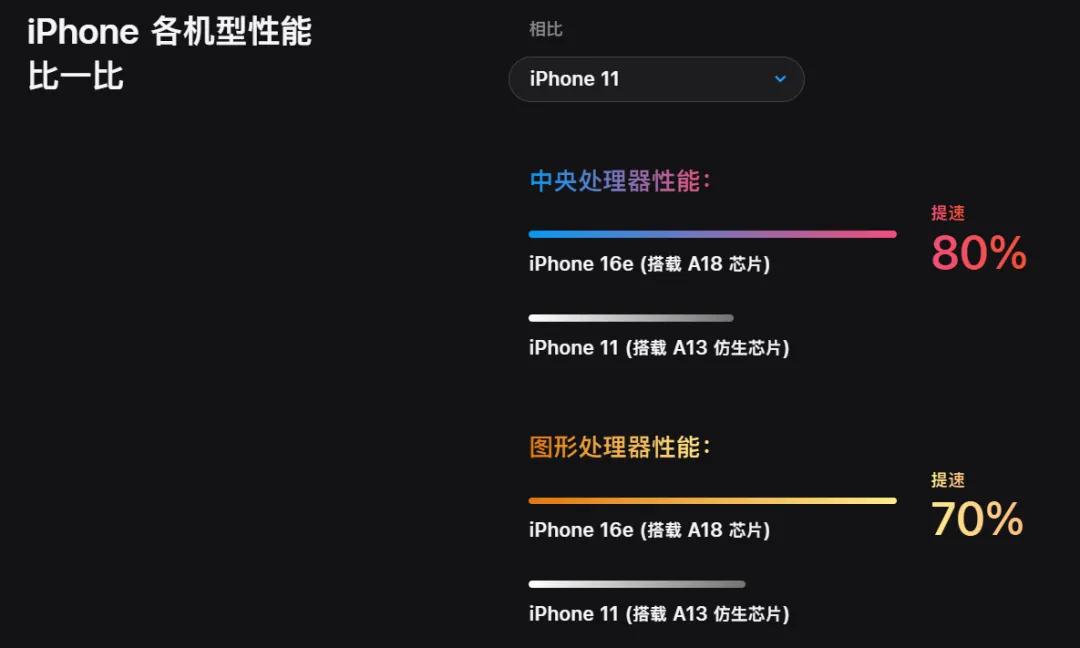 新机采用与iPhone 16相同的A18芯片,但少了一个GPU芯片。在苹果官网,iPhone 16e默认的对比机型是2019年发布的iPhone 11和2020年发布的iPhone 12。
