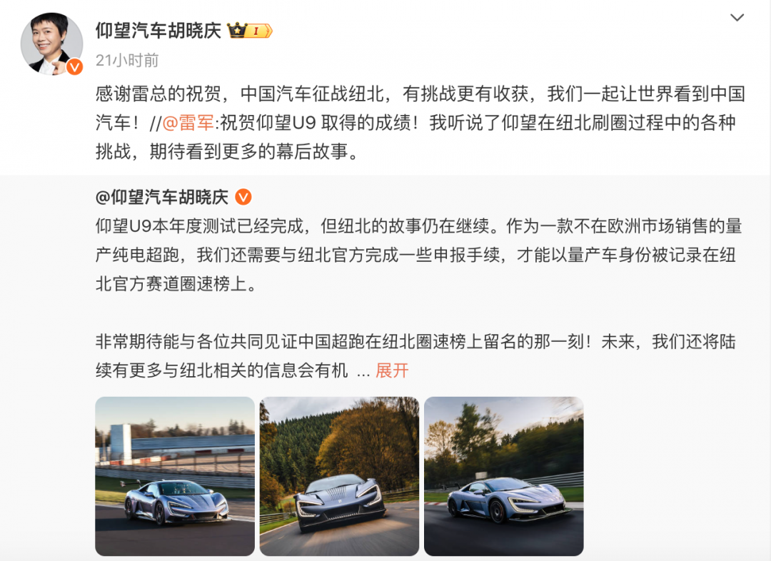 随后, “中国量产超跑纽北首测完成”登上热搜榜。雷军转发了胡晓庆的微博,并称“祝贺仰望U9 取得的成绩!我听说了仰望在纽北刷圈过程中的各种挑战,期待看到更多的幕后故事。”