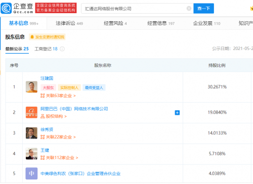 企查查股东信息显示,阿里目前持有其19.08%股份,为第二大股东。而实控人汪健国,直接间接共持有汇通达32.56%的股份。