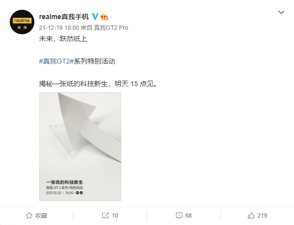 据近日realme官微最新发布的预热海报显示,realme将在本次真我GT2系列特别活动上带来一项“压箱底的黑科技”,并宣称将“揭秘一张纸的科技新生”。从官方的表述来看,这项爆料可能与手机本身关系不大,倒是比较可能与包装盒以及环保有关,不过具体的信息还需要等待官方的正式揭晓。