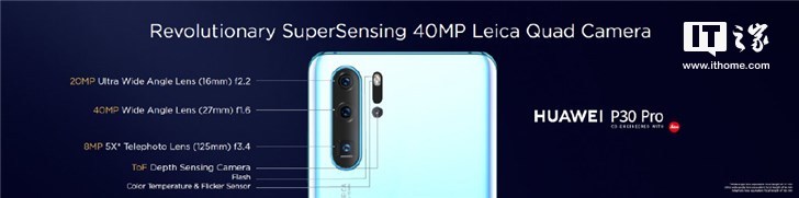 华为P30 Pro主摄像头采用了徕卡四摄,四颗摄像头分别是4000万像素超感光摄像头、2000万像素超广角摄像头、800万像素潜望式长焦摄像头及华为ToF摄像头。