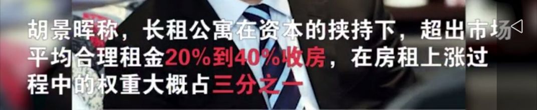 原我爱我家副总裁、中国房地产经纪同业联盟主席胡景晖近日爆料:“长租公寓在资本的挟持下,超出市场平均合理租金的20%到40%收房,在房租上涨过程中的权重大概占三分之一。”