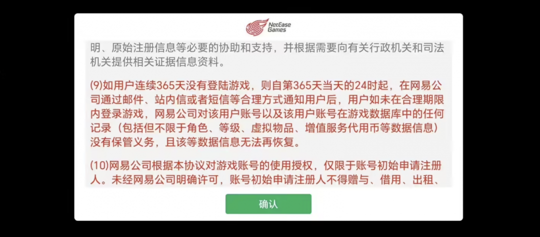 网易游戏更新其中一则条款写明:“如用户连续 365 天没有登陆游戏,则网易公司通知用户后,用户如未在合理期限内登录游戏,网易公司对该用户账号以及该用户账号在游戏数据库中的任何记录没有保管义务,且该等数据信息无法再恢复。”